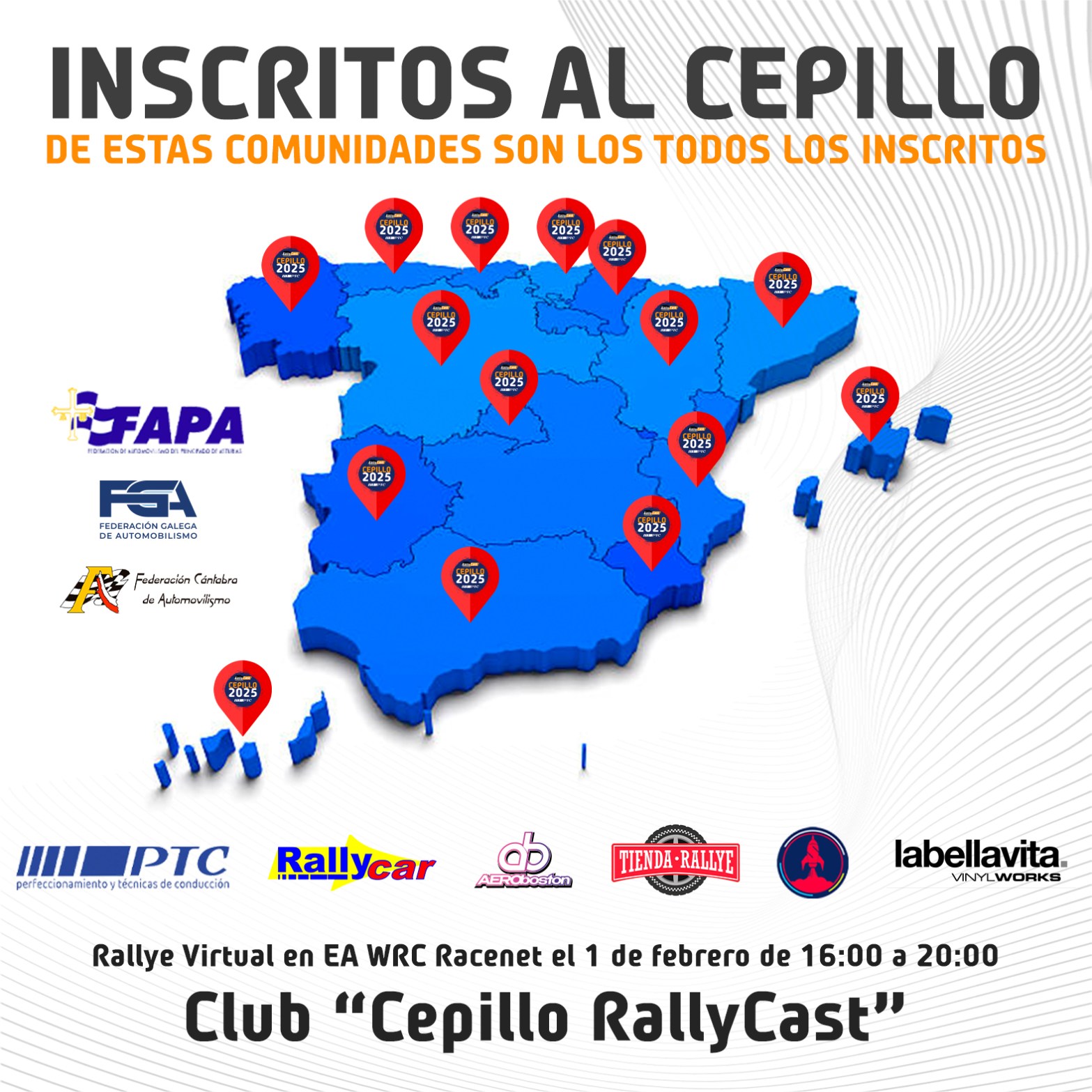 Publicada ya la lista definitiva de inscritos al Cepillo RallyCast. Esta misma tarde (1 de febrero de 2025) tendrá lugar la primera fase. Los 81 tendrán que correr un Rallye Virtual dentro del EA WRC en el Club Cepillo RallyCast. Los tramos se publicarán a las 15:30 en el mismo club y se podrá empezar a correr a las 16:00.